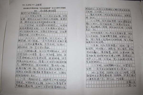 “我为祖国筑梦”主题征文活动,凝聚莘莘东外情,纸笔心系家国梦。学生们以“写给三十年后的自己”这一书信形式,道出了内心诚挚深沉的爱国情。“如果你是一名士兵,就用你的头颅坚守脚下这片土地;如果你是一名教师,就用你的心血培养下一代祖国栋梁;如果你是一名农民,就用你的汗水让贫困山区的儿童多吃上一粒米……”孩子们的心声如此赤诚,将个人理想和伟大祖国的复兴之梦紧密相连,誓要“今日为中华之崛起而读书,明日为东方之破晓而奋斗”!