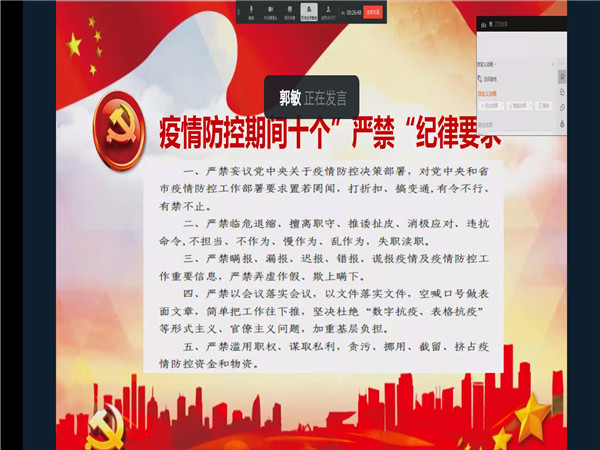 郭书记首先分享了《我是党员,我先上》的微视频,在片中我们看到在与新冠肺炎疫情的严肃斗争中,习近平总书记作出重要指示要求各级党组织和广大党员干部团结带领广大人民群众坚决贯彻落实党中央决策部署,紧紧依靠人民群众坚决打赢疫情防控阻击战。在总书记的号召下,广大党员干部冲在了抗疫的第一线,他们中有主动请缨奔赴隔离病房不分昼夜抢救病人的白衣战士;也有严防在各个社区、高速路口挨个排查、登记的公务人员;还有为建设火神山医院日夜奋战的党员突击队队员……危难时刻,共产党员为国请战,只因人民利益高于一切,急人民之所急,解人民之锁忧。一个党员就是一面旗帜,党旗在防控疫情斗争第一线高高飘扬。